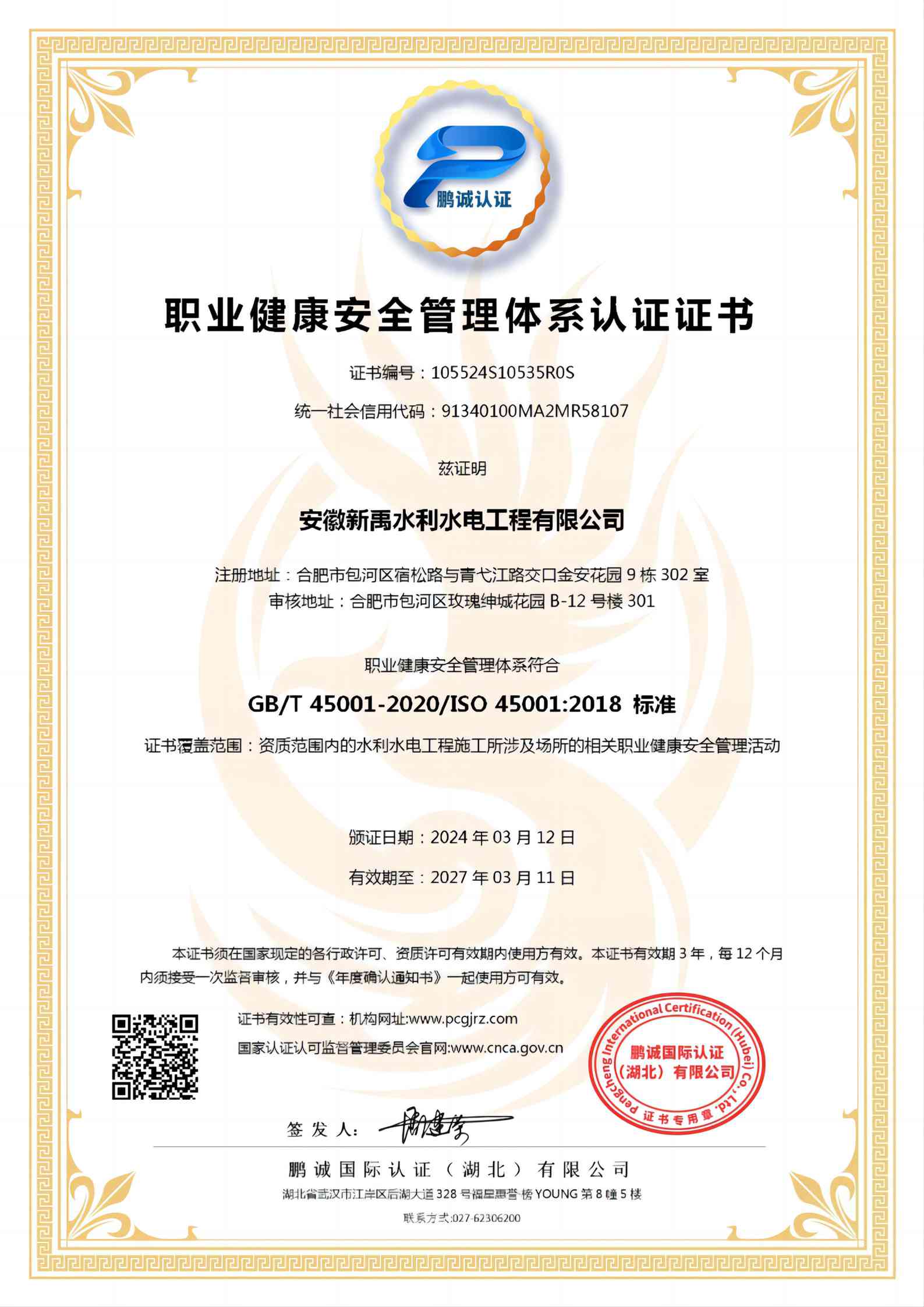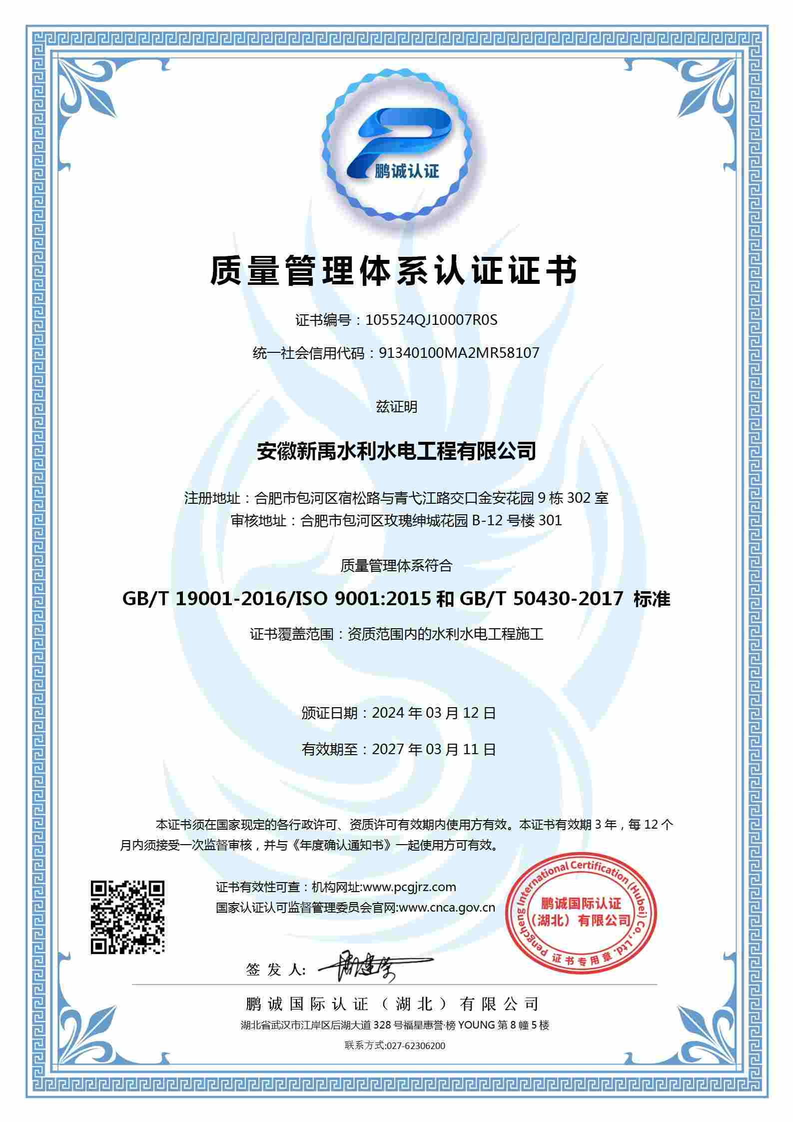 安徽新禹水利水電工程有限公司成立于2015年12月3日,注冊資產1200余萬元。現具有水利水電工程施工總承包三級、公路工程施工總承包三級、市政工程施工總承包三級資質、建筑工程施工總承包三級,地質災害治理施工丙級資質、地基基礎工程專業承包三級,城市級道路照明工程專業承包三級,環保工程專業承包叁級以及勞務專業承包等施工能力的新型綜合性施工公司。