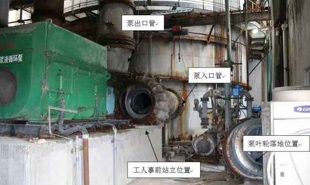 14時38分,當(dāng)工作人員擰下A泵端蓋兩側(cè)螺栓,開始用頂絲持續(xù)頂泵體端蓋時,A漿液循環(huán)泵泵體突然隨大量漿液水沖出,位于端蓋前檢修人員于某受撞擊倒地,遭其碾壓,右側(cè)大腿嚴(yán)重受傷。