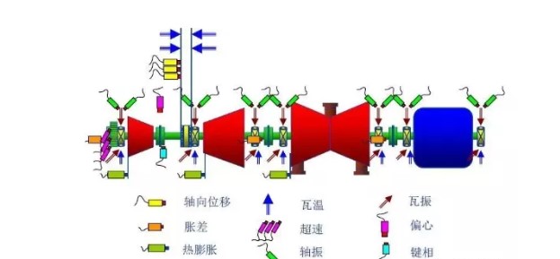 連續(xù)監(jiān)測轉(zhuǎn)子相對于汽缸上一基準(zhǔn)點(diǎn)(一般為推力軸承)的膨脹量,通常采用電渦流傳感器進(jìn)行測量,也是保護(hù)轉(zhuǎn)子與靜子部件之間不發(fā)生摩擦的重要信號(hào),當(dāng)脹差過大時(shí)發(fā)出報(bào)警或者停機(jī)信號(hào)。