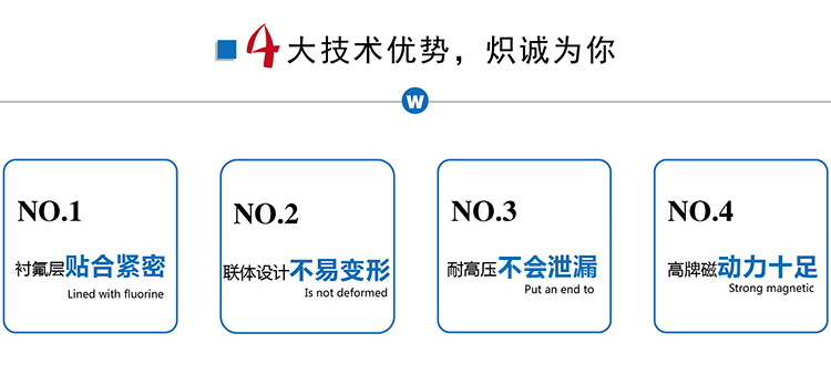 ZMD襯氟自吸磁力泵是我公司新一代耐腐蝕自吸磁力泵,它不但集氟塑料磁力泵的優點于一身,而且具有自吸功能、無泄漏,這是以往的所有氟塑料磁力泵不能達到的,因此,該系列泵一推出就受到了廣大用戶的歡迎。該系列泵可廣泛適用于化工、有色金屬冶煉、農藥、制酸制堿、造紙、酸洗工藝、稀土分離、電鍍、電子、化成箔、卸酸堿等行業或工作流程,是目前磁力泵品種中結構新穎的產品之一,且高效節能、安全實用。