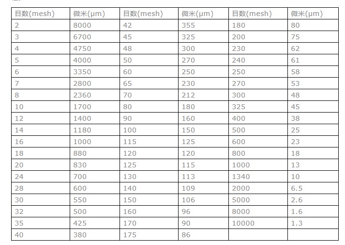 目是什么單位?篩網過濾網目數與粒徑(μm)關系?