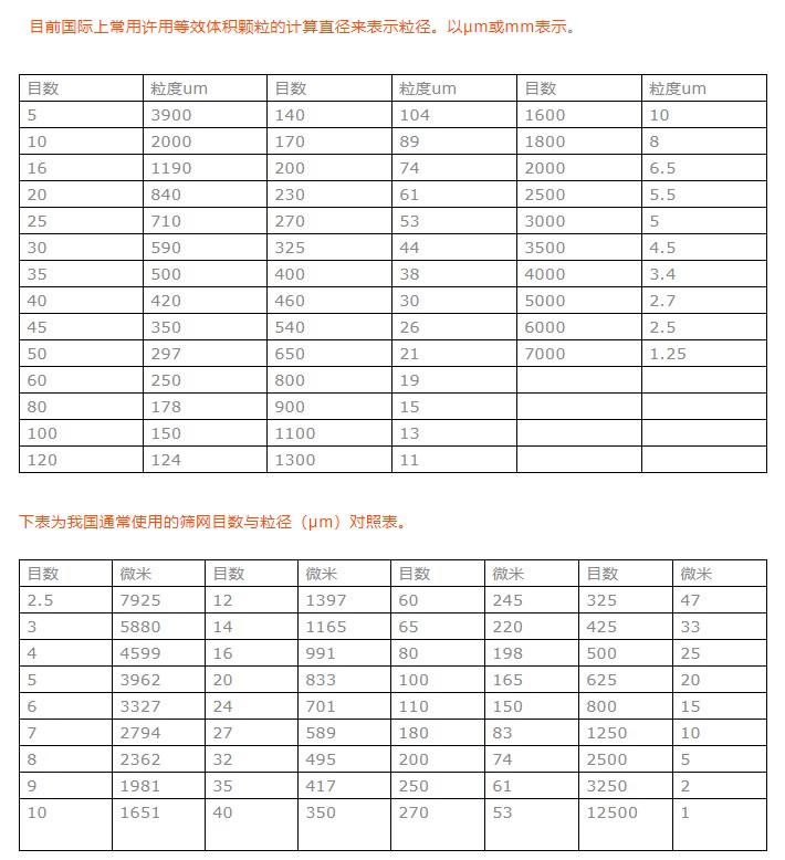 計量單位目粒度是指原料顆粒的尺寸,一般以顆粒的大長度來表示。網目是表示標準篩的篩孔尺寸的大小。在泰勒標準篩中,所謂網目就是2.54厘米(1英寸)長度中的篩孔數目,并簡稱為目。
